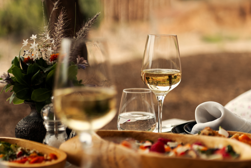 The onsite kitchen gardens provide much of the organic produce for the farm-to-table menu, which features traditional Moroccan dishes and Mediterranean flavours. Most of the year, dining is enjoyed under a canopy of wisteria. During cooler months, a fire is lit at the boma for pre dinner drinks and the indoor dining space offers a cosy refined space with crackling fires.