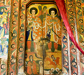 South of Gondar, you can find the bathing palace of Fasiladas, which is filled with water once a year for the Timkat (Epiphany) ceremony. To the North-West, are buildings belonging to the government of the time, most of which are now ruins. The largest of these is a three-storeyed castle, the battlement parapets embellished with bas reliefs of Ethiopian animals. There are also many churches here, including Debre Birhan Selassie, the roof of which is decorated with winged angels, and the walls with biblical depictions, including the crucifixion, and the legend of St George and the Dragon. The churches of Gondar contain ancient Gondarine manuscripts, and a crypt holds the skeletal remains of Empress Mentewab her son, Emperor Iyasu II, and her grandson Emperor Iyo’as.